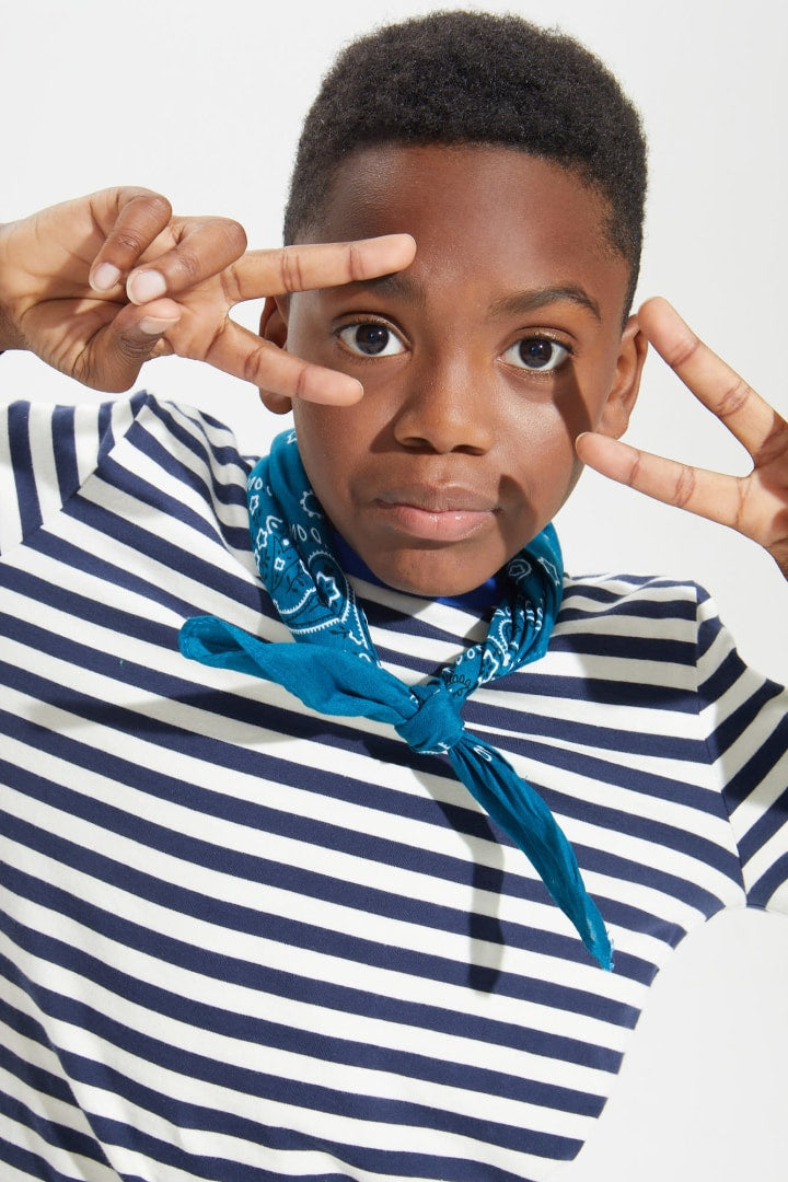 This classic striped tee with a twist gets our ROA stamp of approval! Long sleeves make this tee perfect for layering or wearing solo. The stamp hem graphic ads a textured pop of fun to this year round staple.